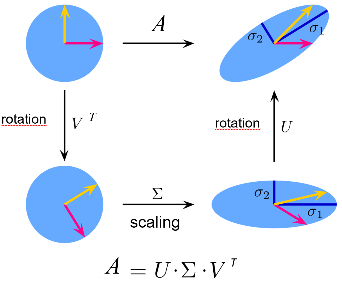 We can apply the SVD of A and we obtain three matrices, each will have an effect on the vectors and by applying all three, the effect will be the same as applying .